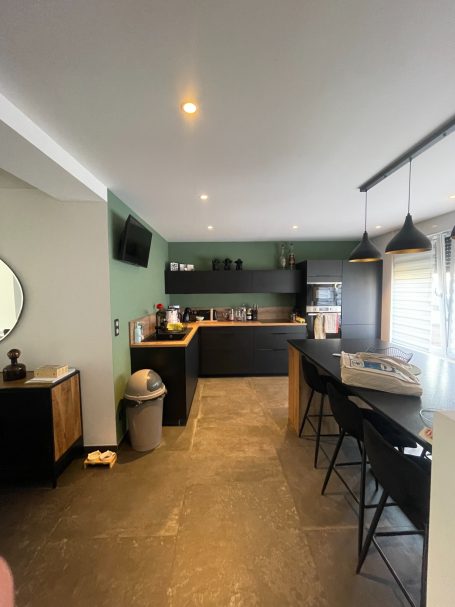 Le vert sombre et les nuances chaudes viennent contraster avec la luminosité des plafonds et souligner les lignes contemporaines du mobilier.