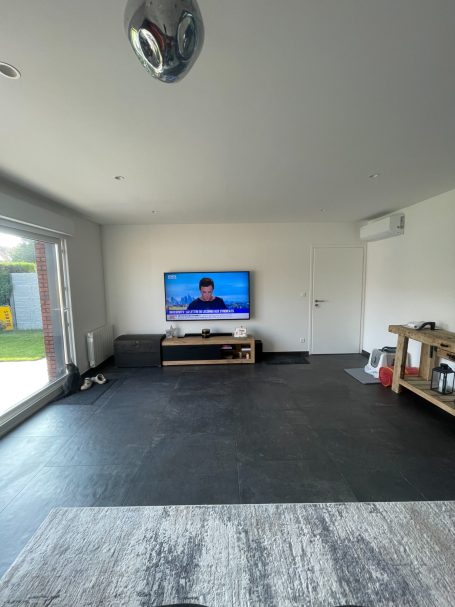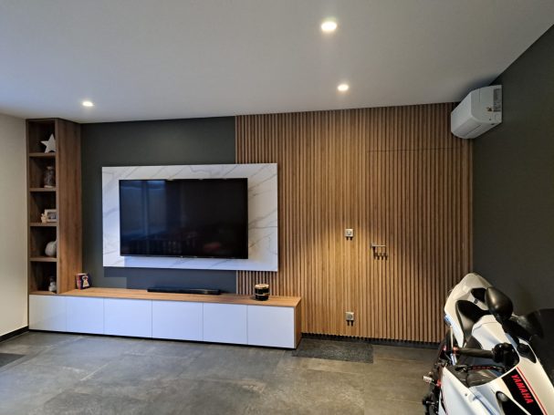 Le mur TV a été traité comme un véritable élément architectural. Un panneau effet marbre pour encadrer l’écran, ainsi qu'un habillage en tasseaux bois pour rythmer l’espace et assurer la continuité murale qui intègre discrètement les portes pour un rendu épuré et structuré.